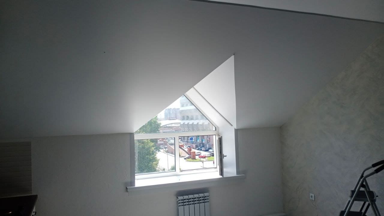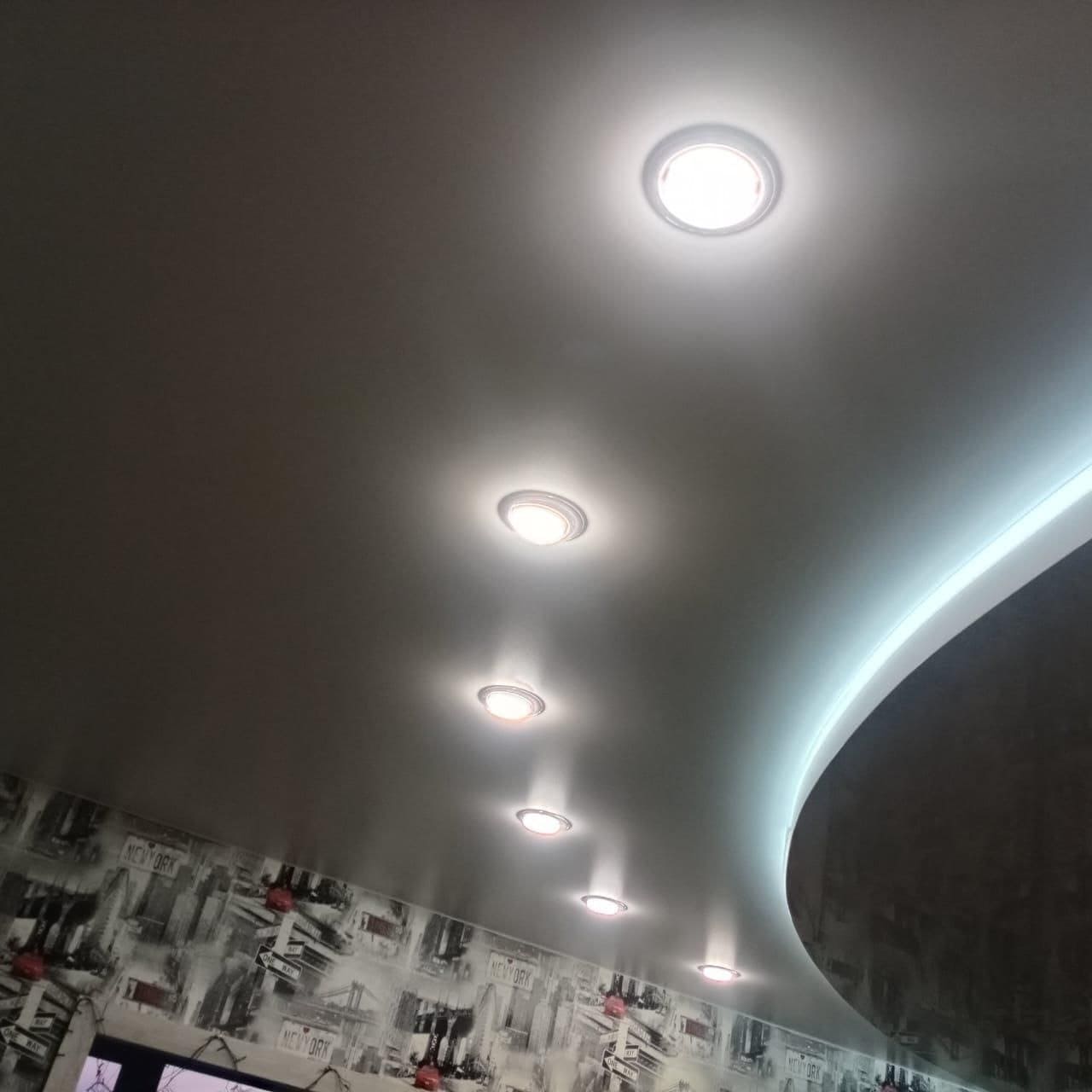 Гладкое блестящее полотно, отражающее свет и визуально увеличивающее пространство, устойчивое к влаге и простое в уходе.