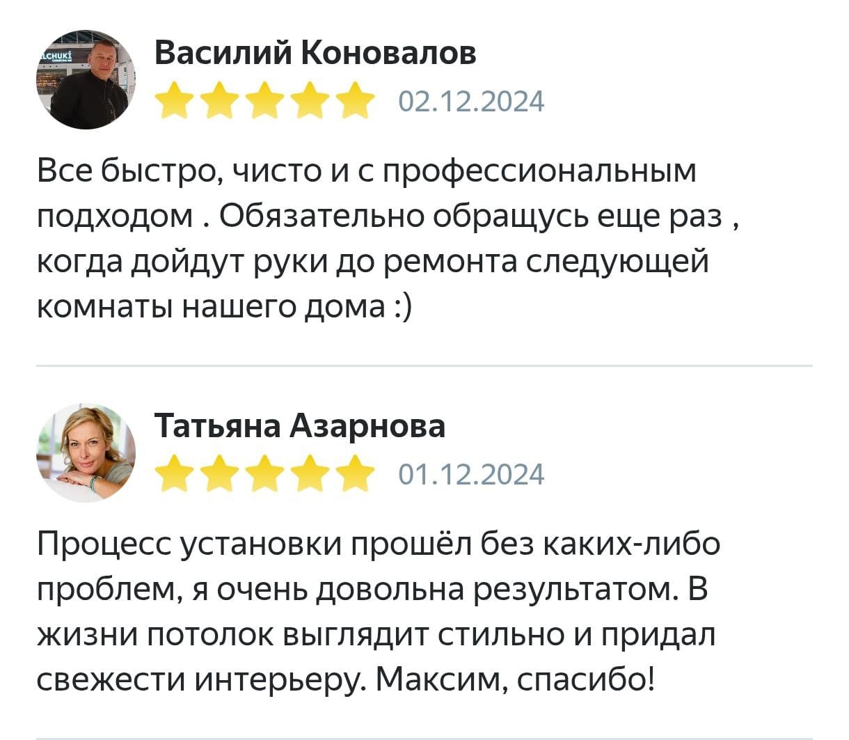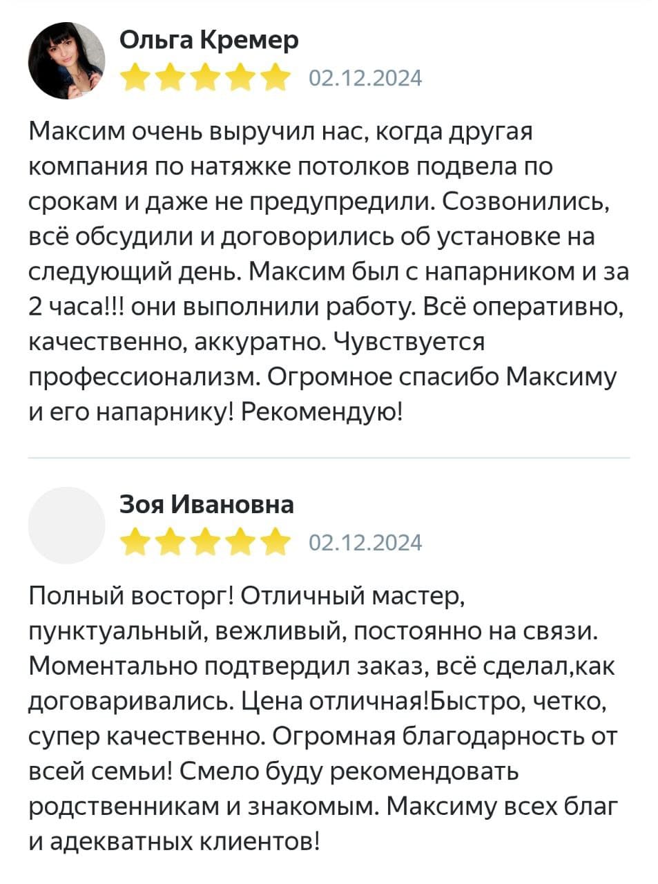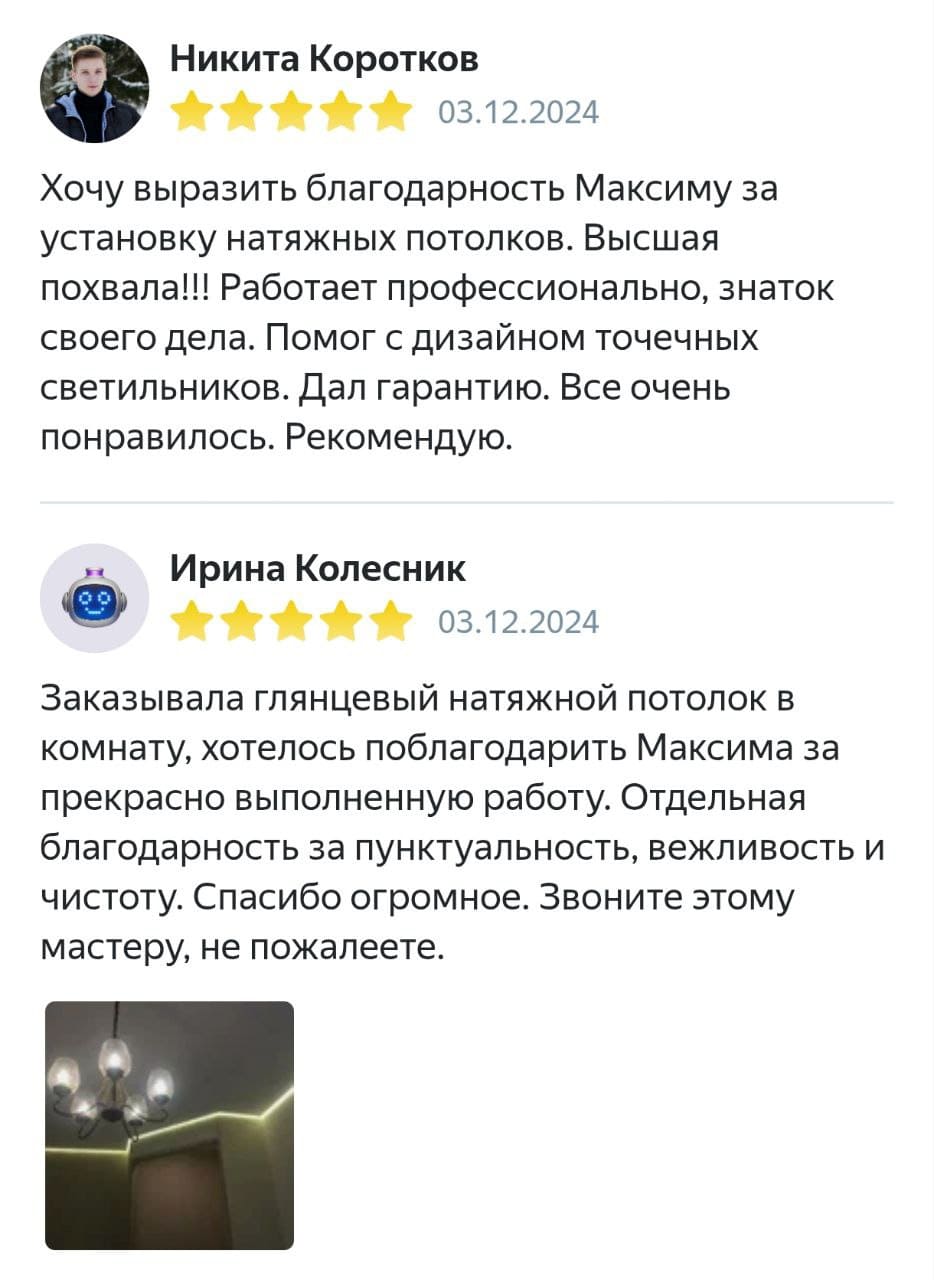 "Здравствуйте. Меня зовут Максим Кочетков. Я - основатель компании KochetkoFF. Мы занимаемся потолками более 10 лет, имеем несколько бригад настоящих мастеров своего дела. Используем безопасное профессиональное оборудование. Я уверен в качестве работы своих мастеров на все 100%, поэтому смело даю такую гарантию.