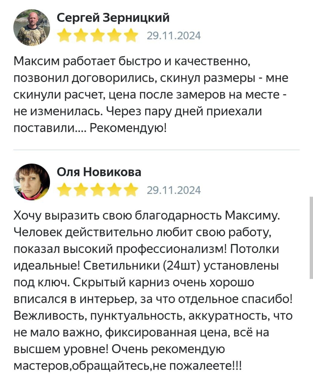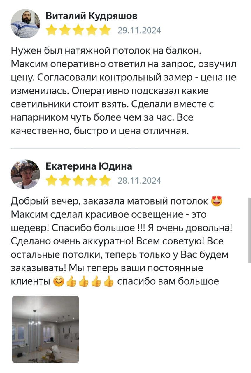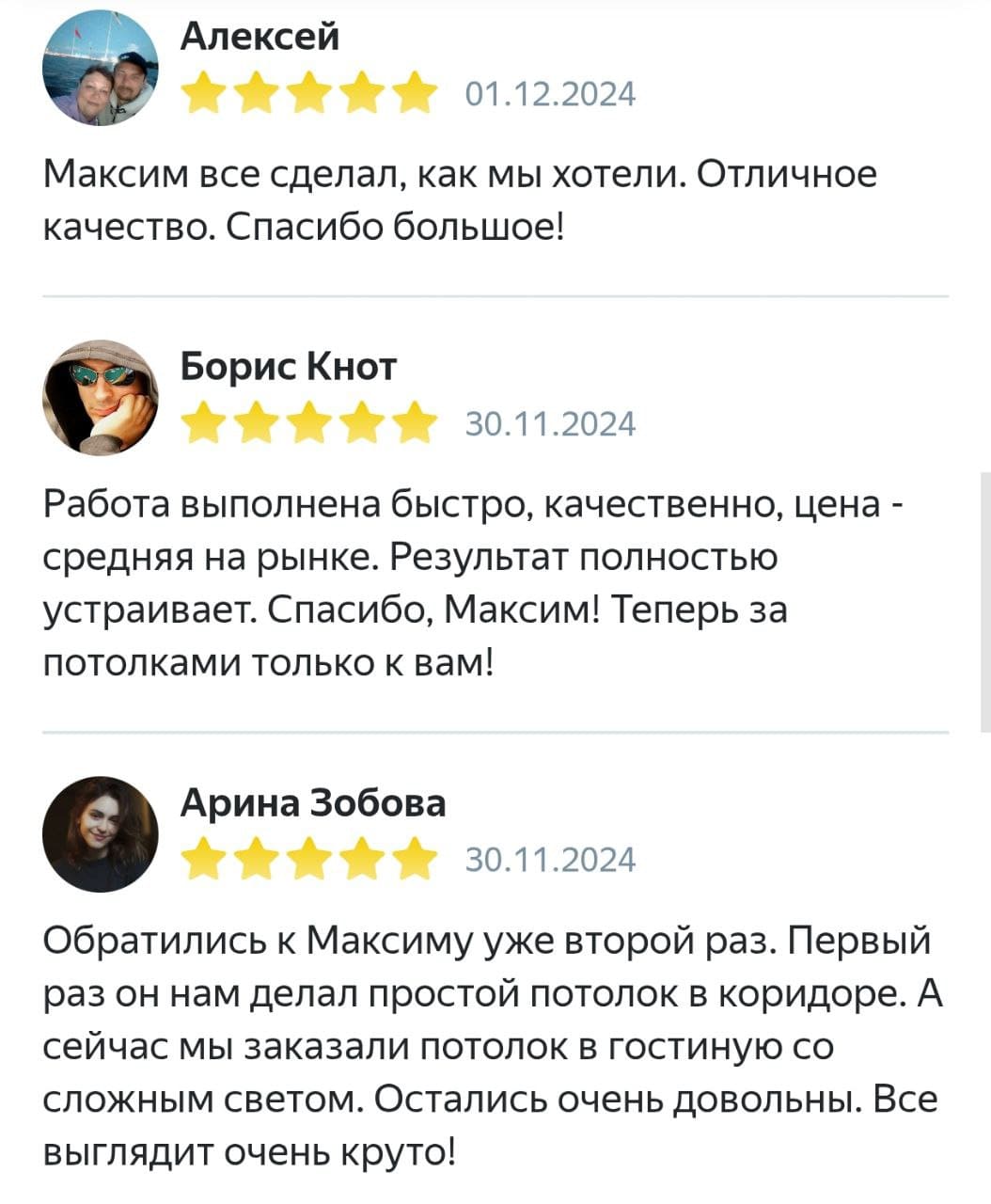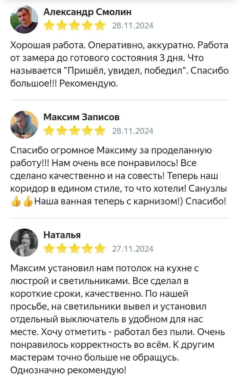 "Здравствуйте. Меня зовут Максим Кочетков. Я - основатель компании KochetkoFF. Мы занимаемся потолками более 10 лет, имеем несколько бригад настоящих мастеров своего дела. Используем безопасное профессиональное оборудование. Я уверен в качестве работы своих мастеров на все 100%, поэтому смело даю такую гарантию.