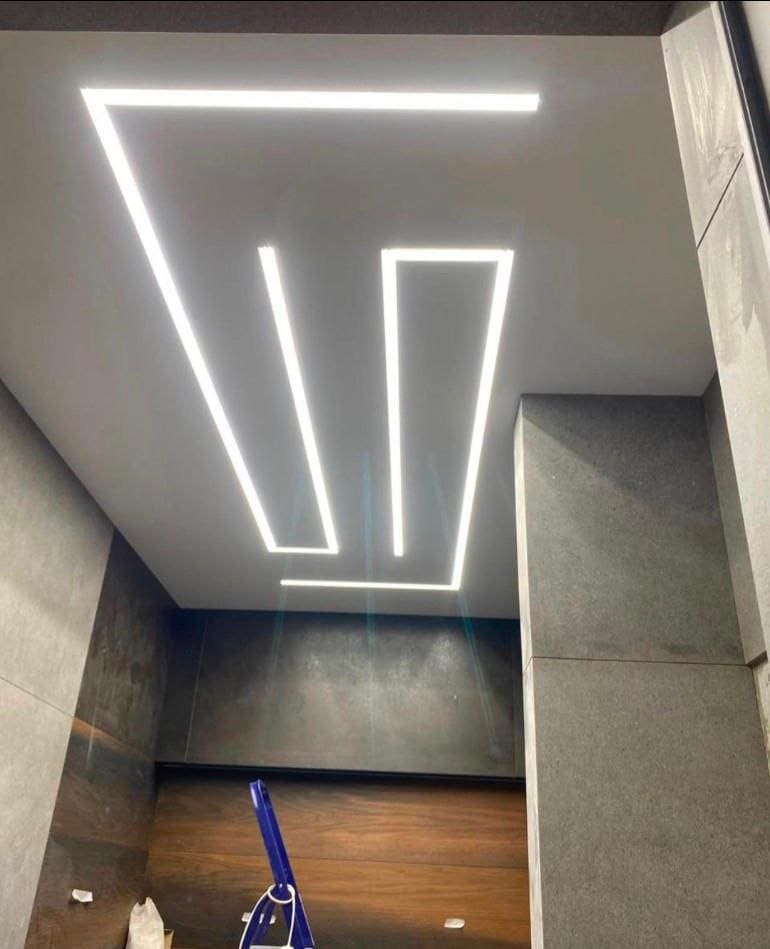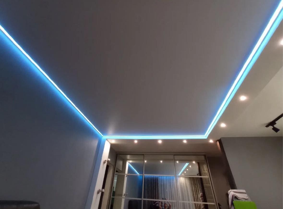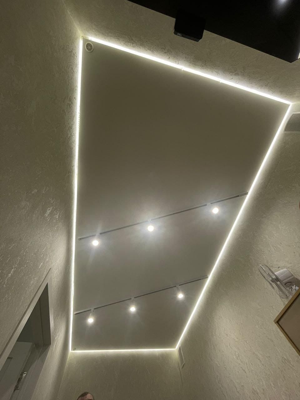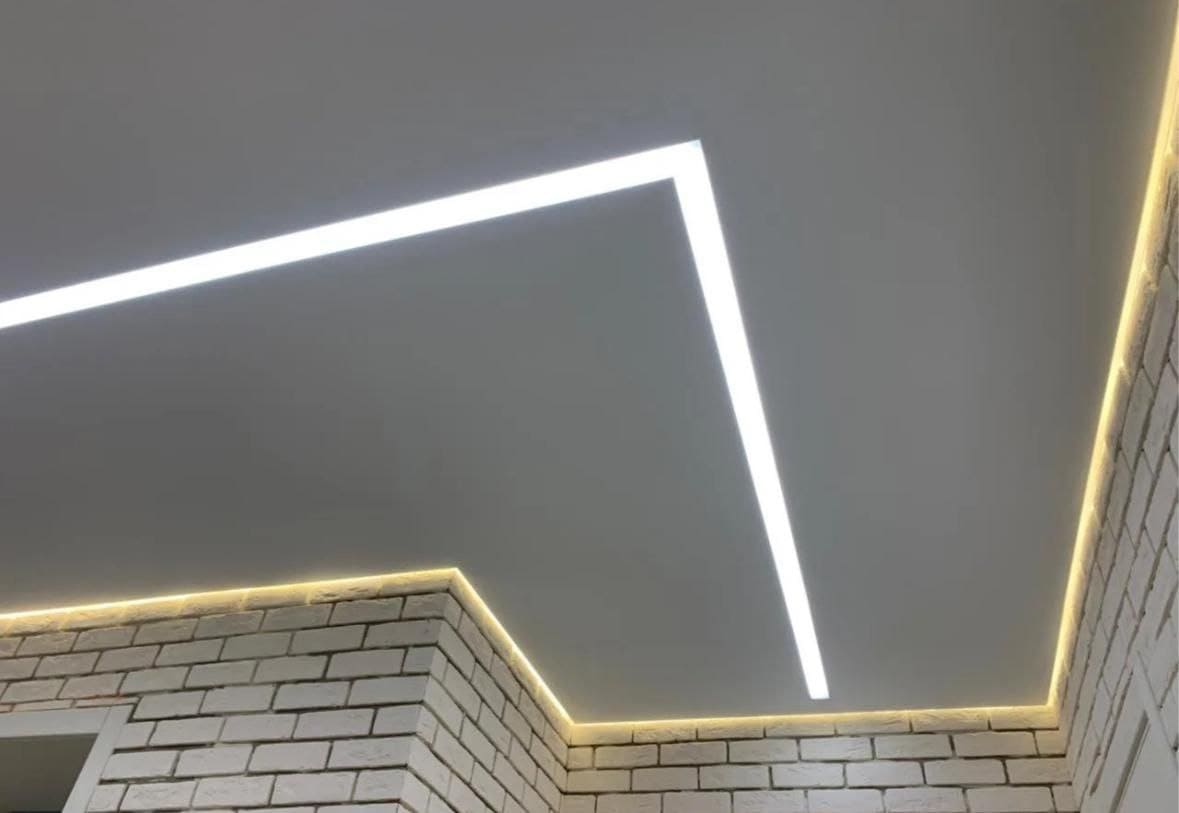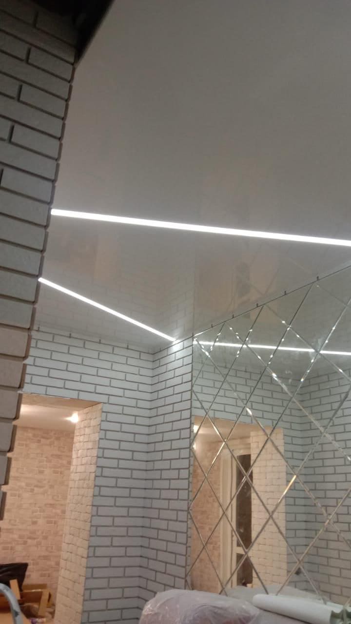 Конструкция с скрытой LED-подсветкой по периметру, создающая эффект воздушного "зазора" между полотном и стеной.