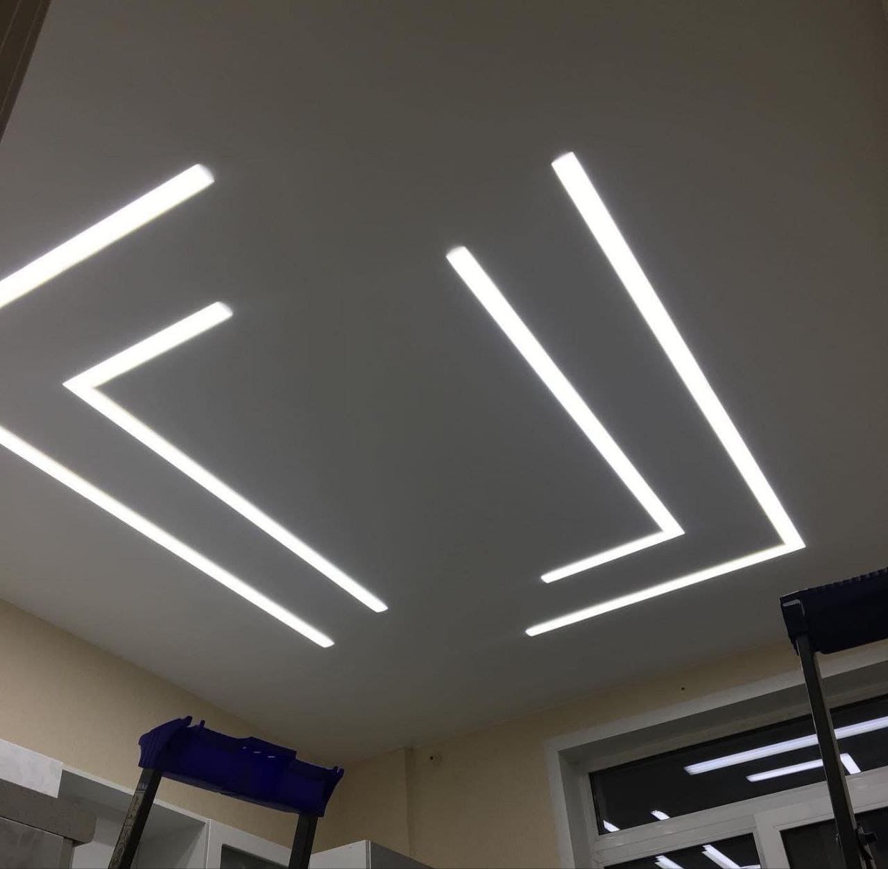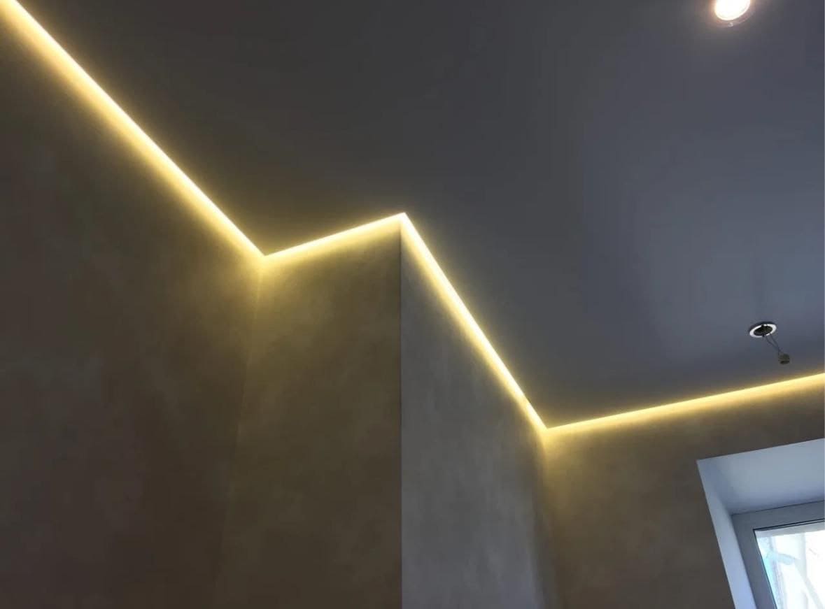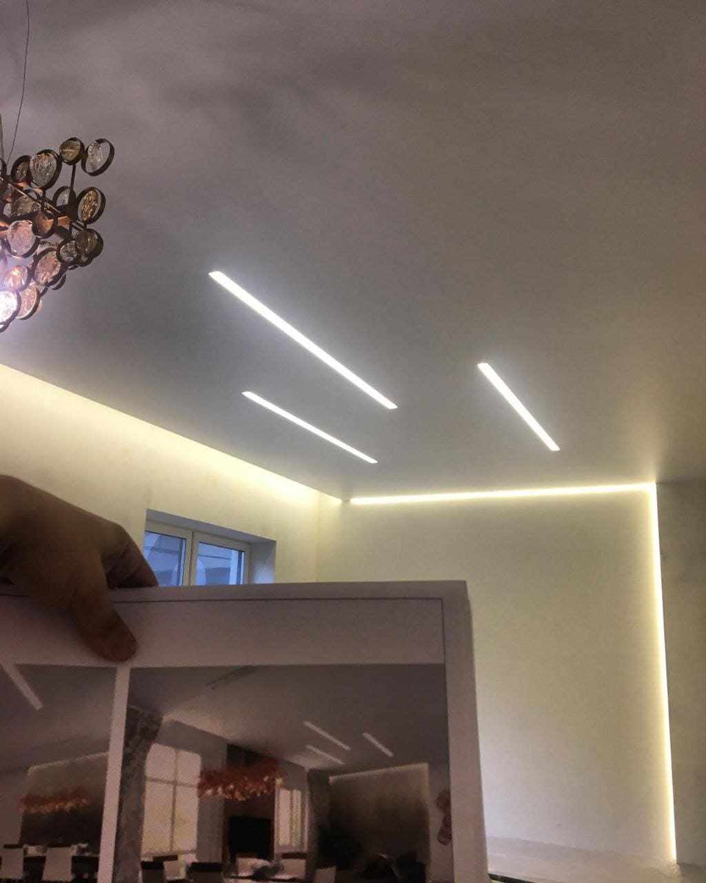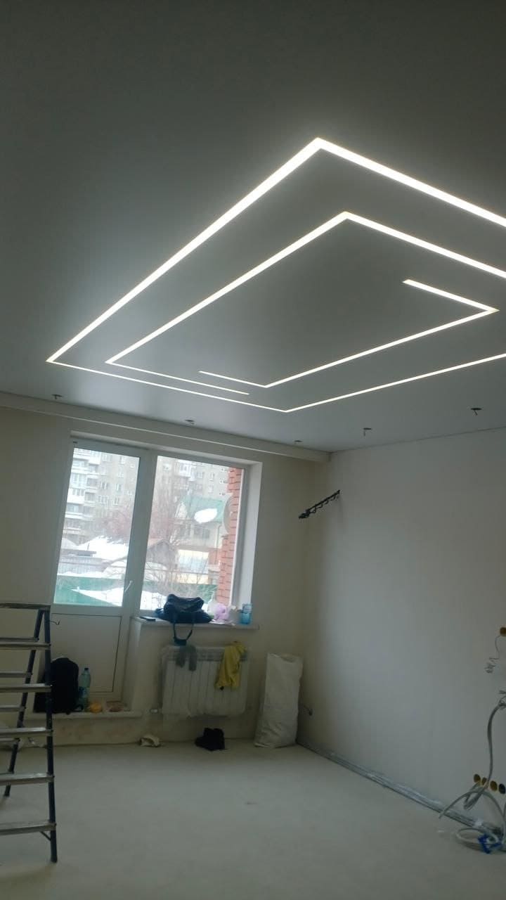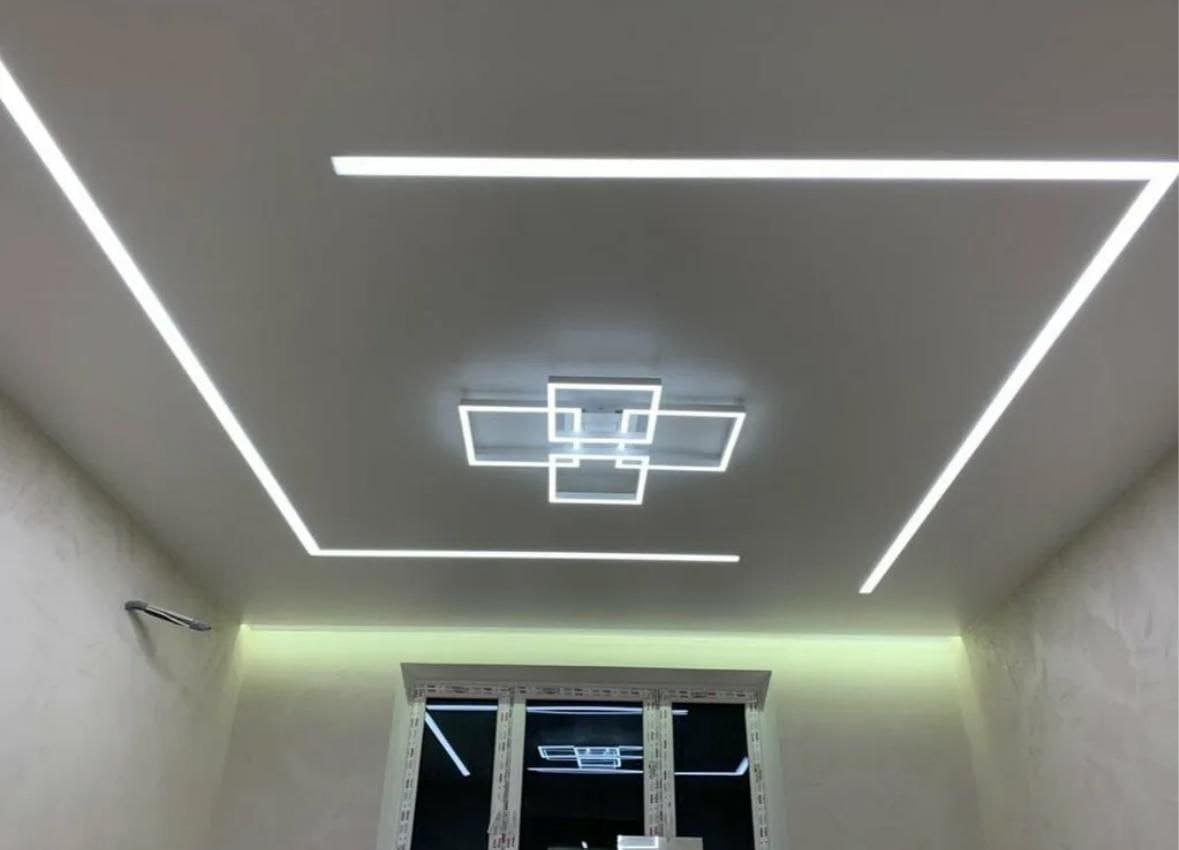 Конструкция с скрытой LED-подсветкой по периметру, создающая эффект воздушного "зазора" между полотном и стеной.
