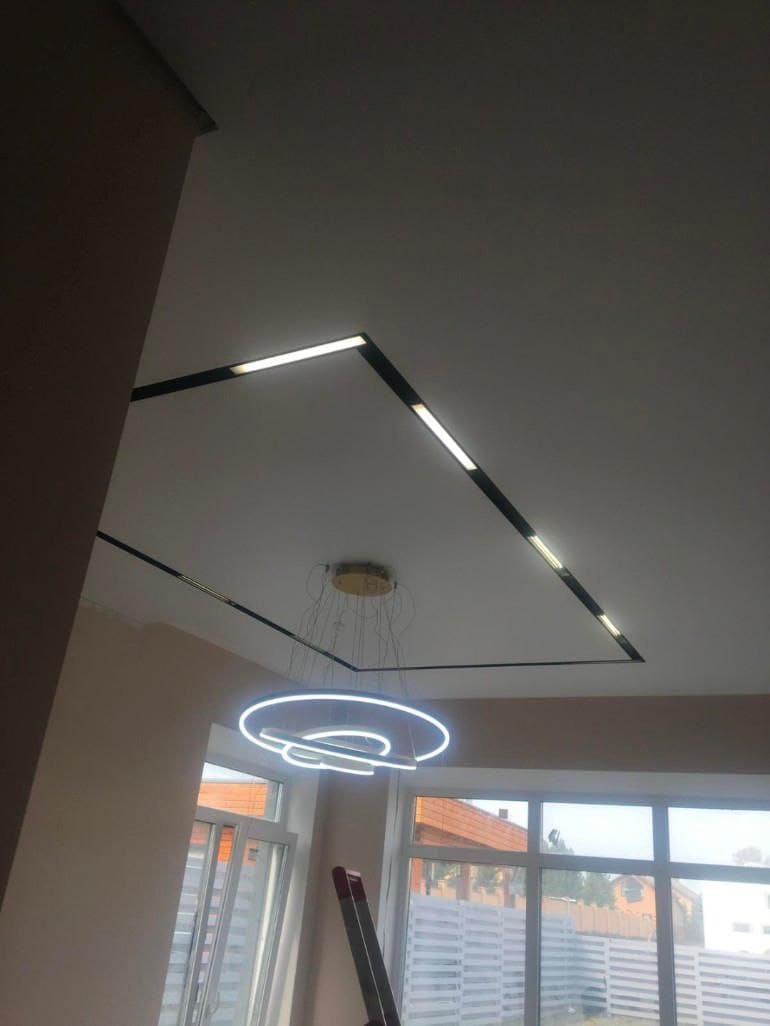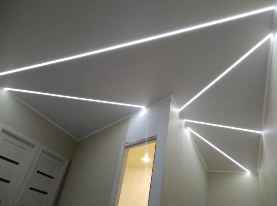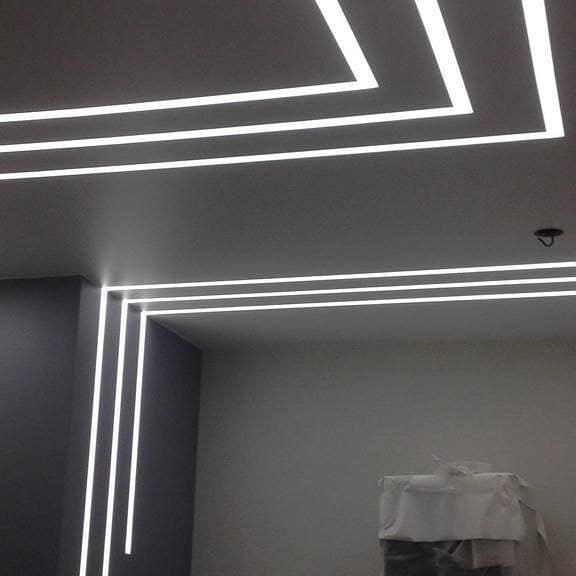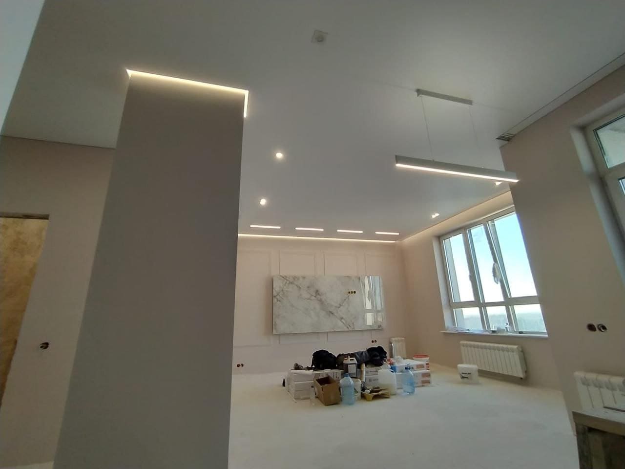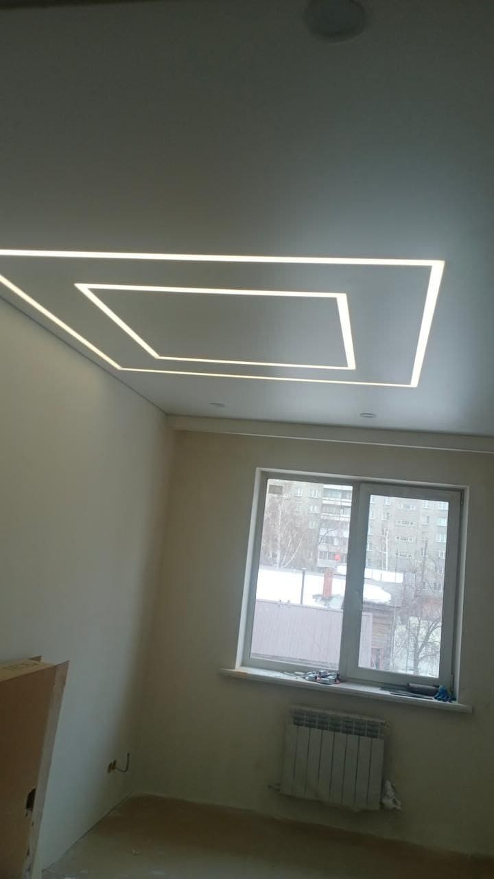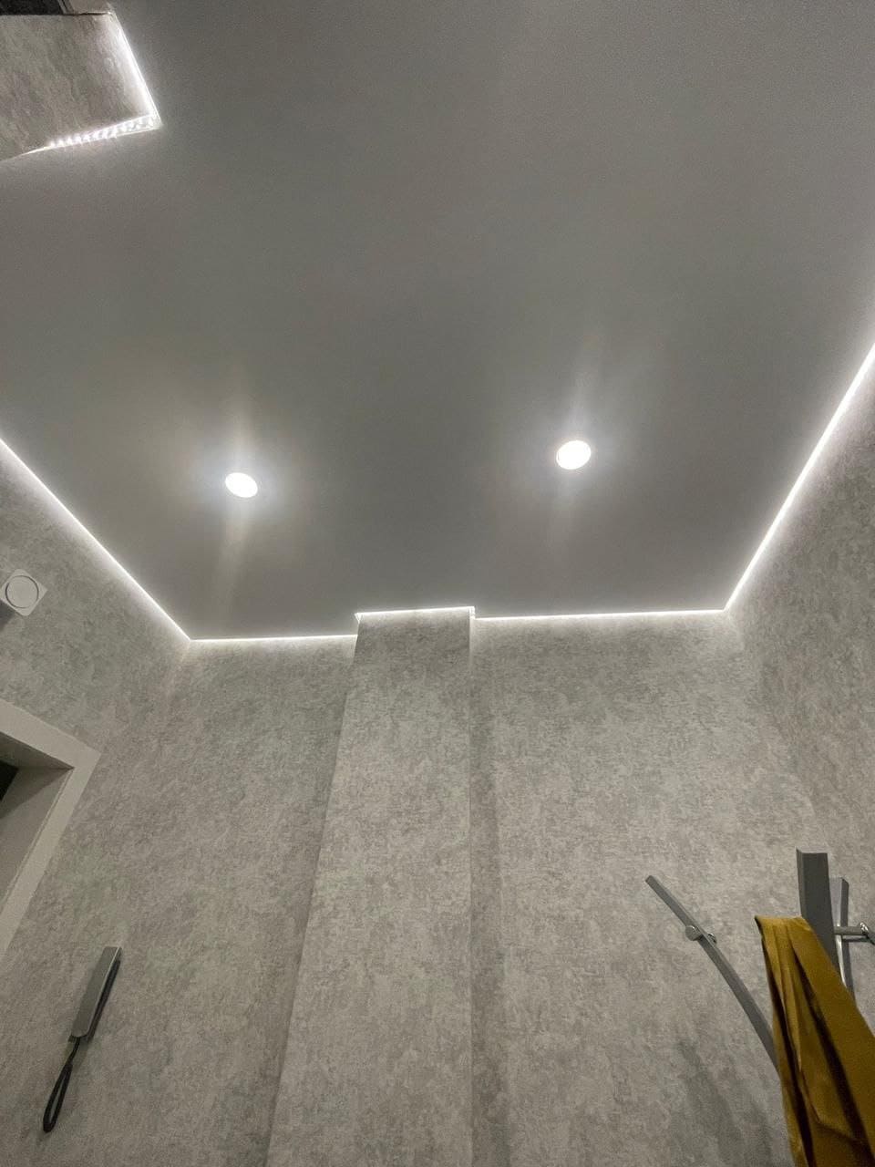 Конструкция с скрытой LED-подсветкой по периметру, создающая эффект воздушного "зазора" между полотном и стеной.