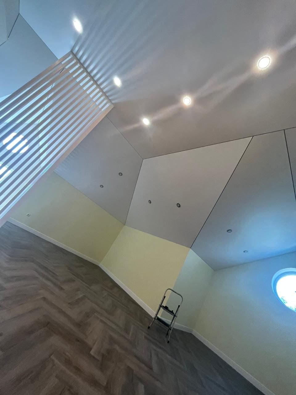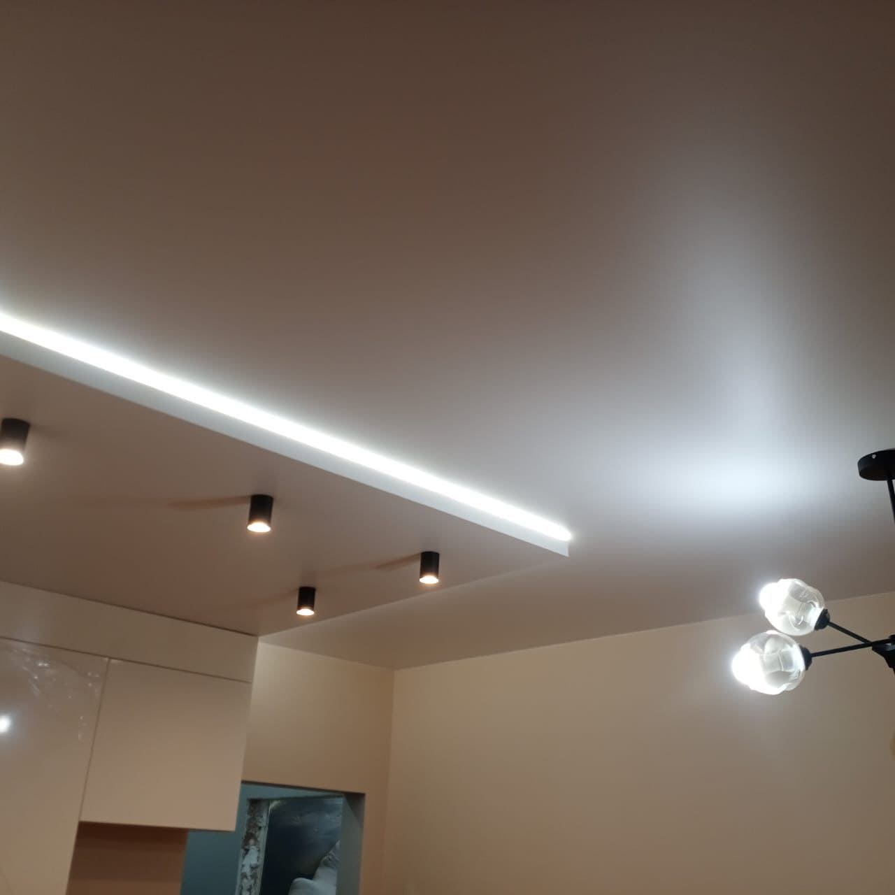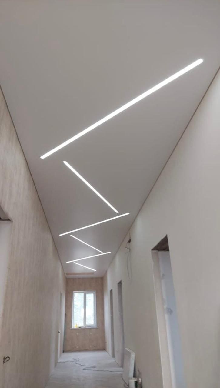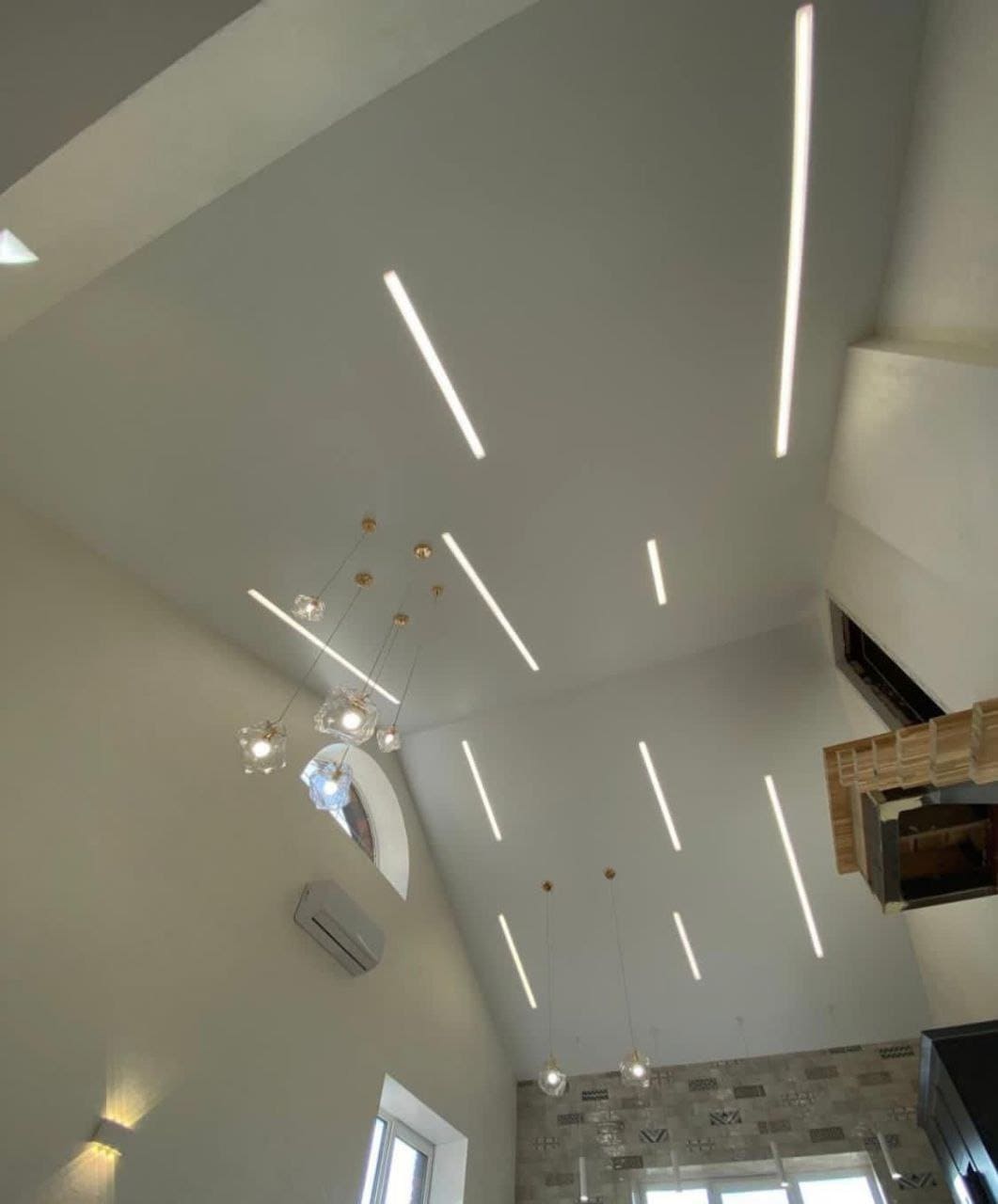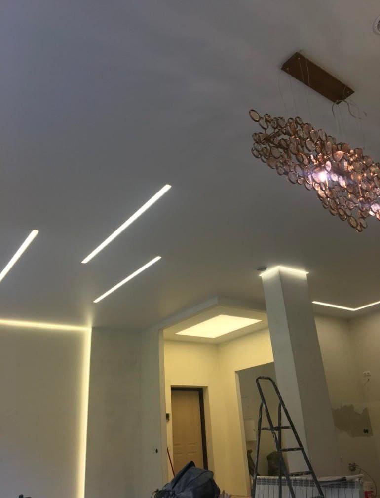 Конструкция с скрытой LED-подсветкой по периметру, создающая эффект воздушного "зазора" между полотном и стеной.