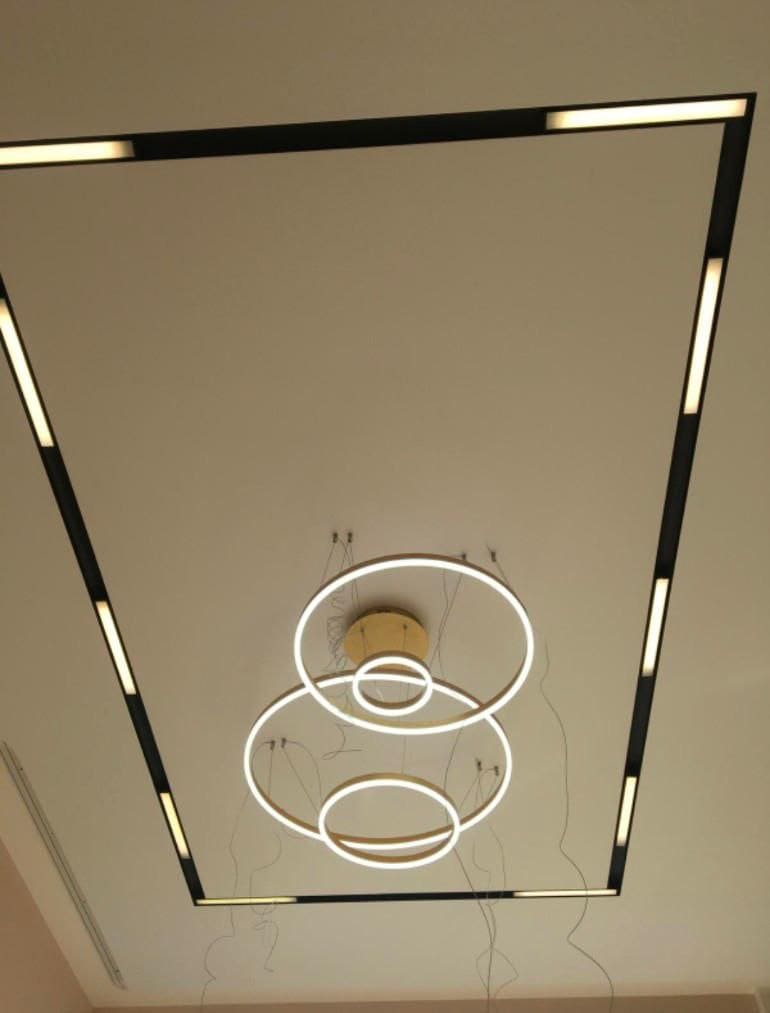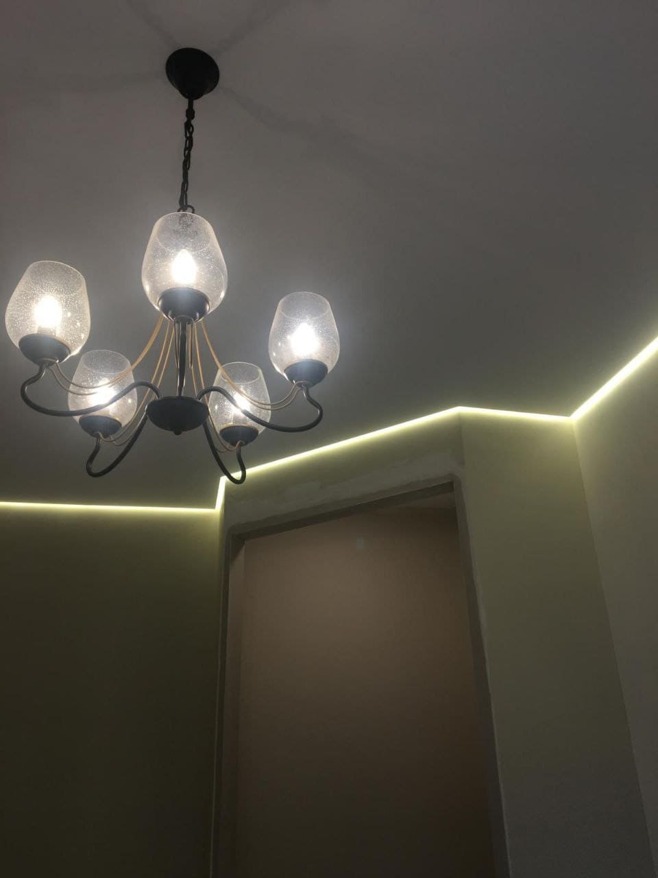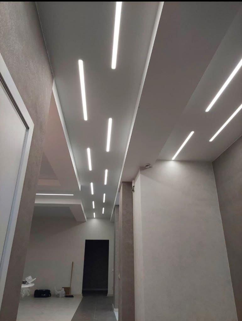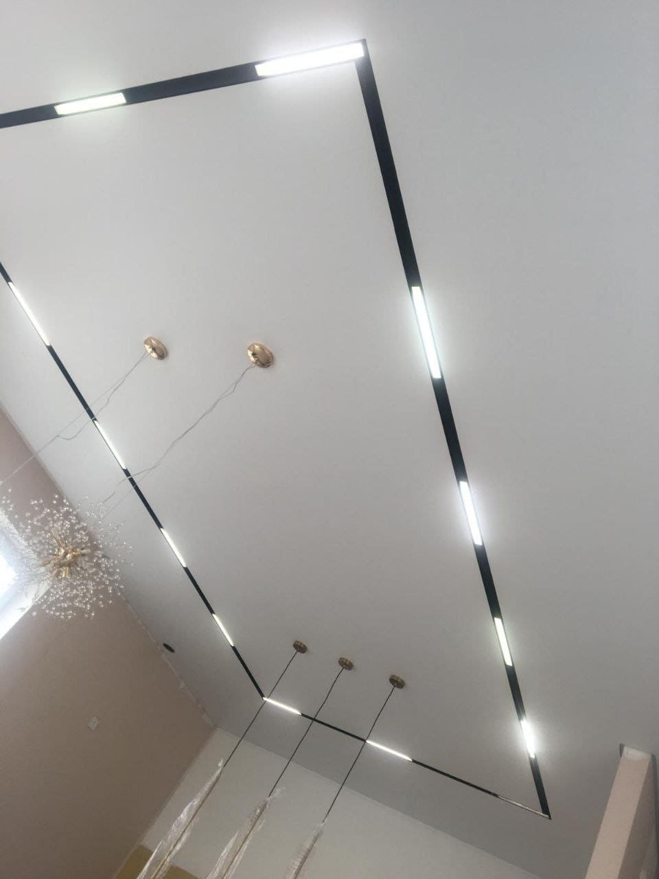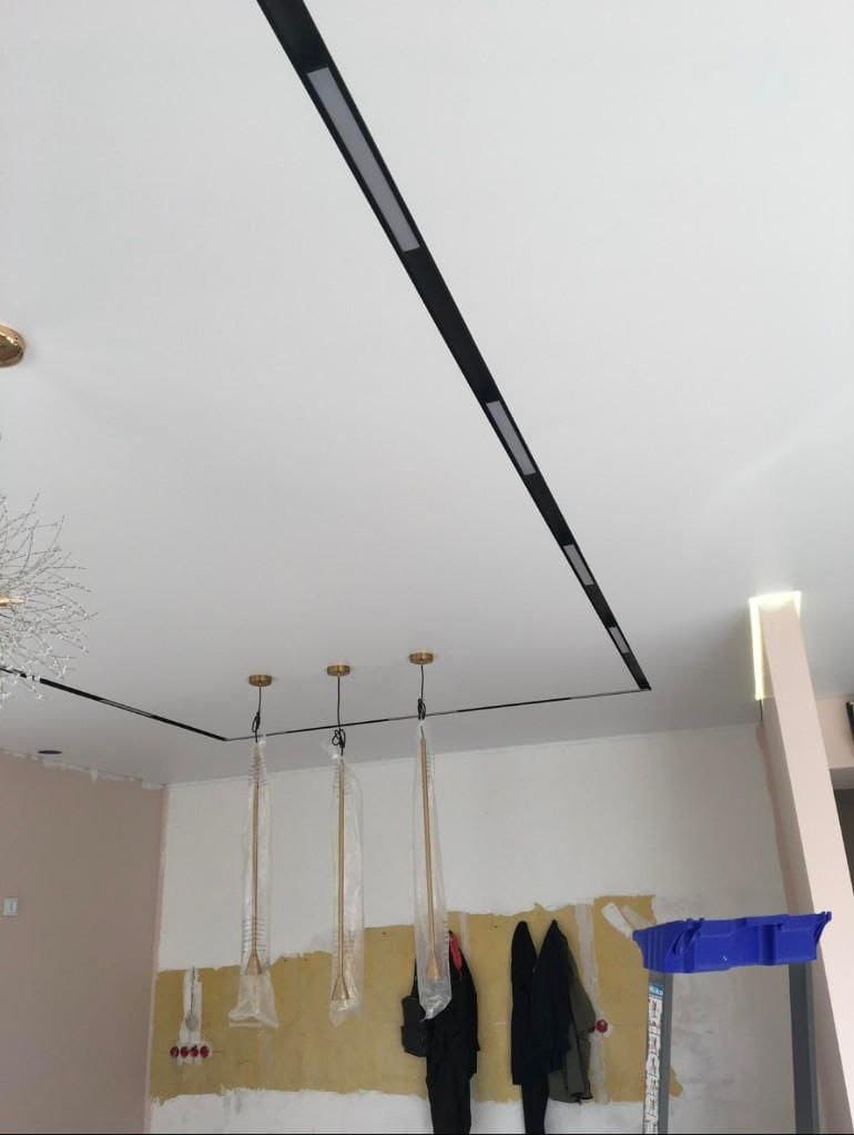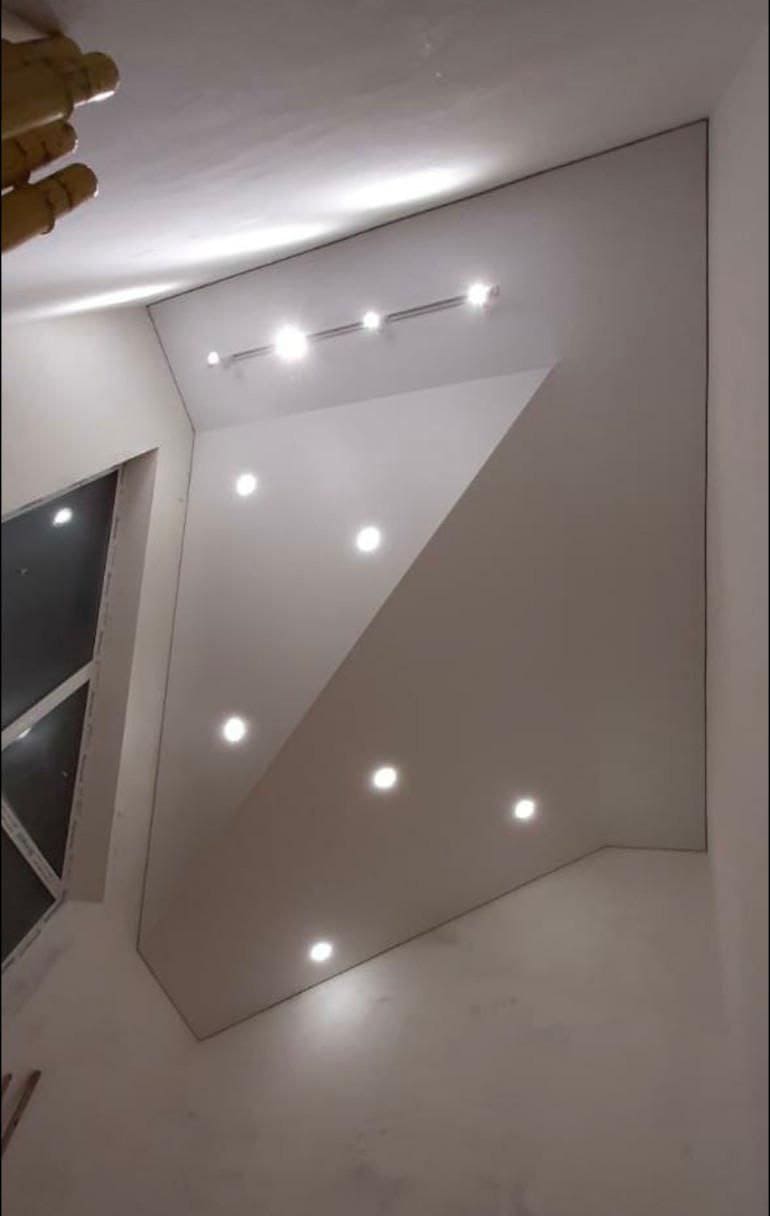 Конструкция с скрытой LED-подсветкой по периметру, создающая эффект воздушного "зазора" между полотном и стеной.