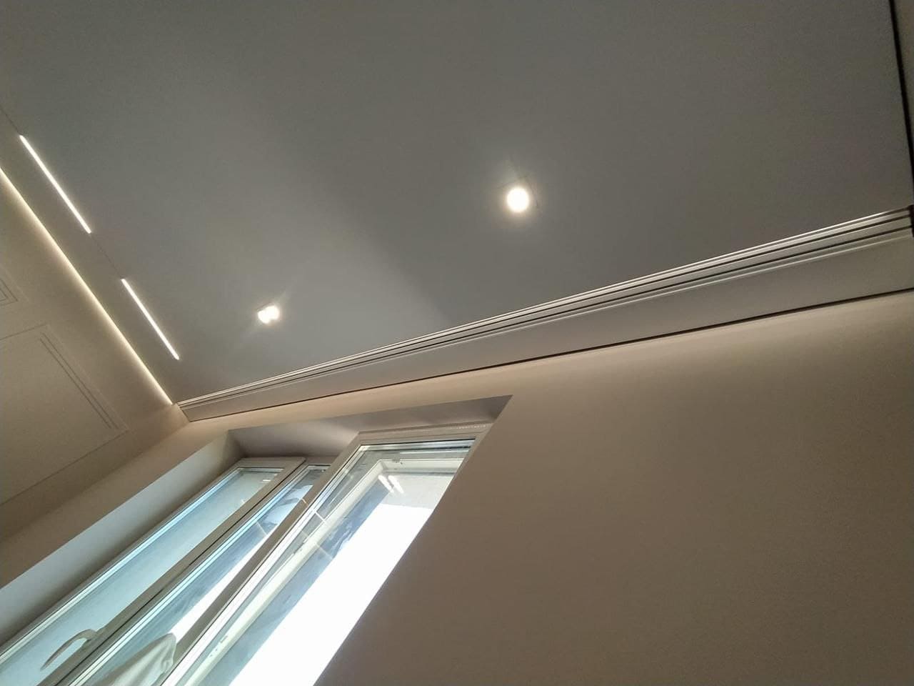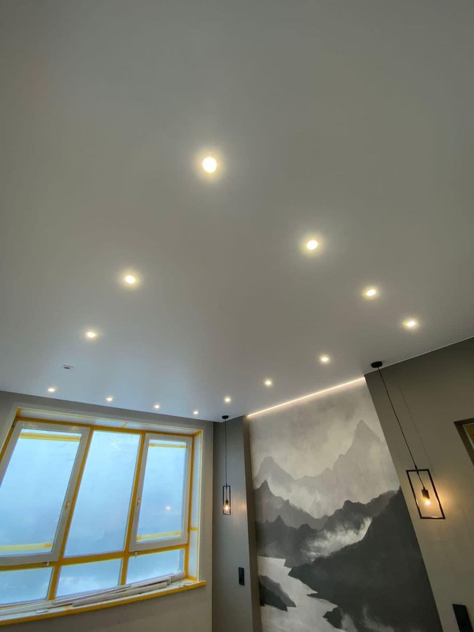 Гладкое, не отражающее свет полотно с текстурой, напоминающей классическую штукатурку, создающее ровную и уютную поверхность без бликов.